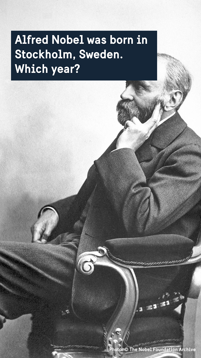 Add the question slides manually on Instagram stories and mark the right answer. Quiz images Download quiz in English (ZIP 25.1 MB) Instagram quiz in English Download quiz in Arabic (ZIP 136.1 MB) Instagram quiz in Arabic Download clean version (ZIP 24.3 MB) Instagram quiz - clean version for translation Captions for the quiz Nobel Week is here! How much do you know about the Nobel Prize and its founder, Alfred Nobel? Test out your knowledge in this Nobel Prize quiz! 1. Alfred Nobel was born in Stockholm, Sweden. Which year? - 1803- 1833 - 1853