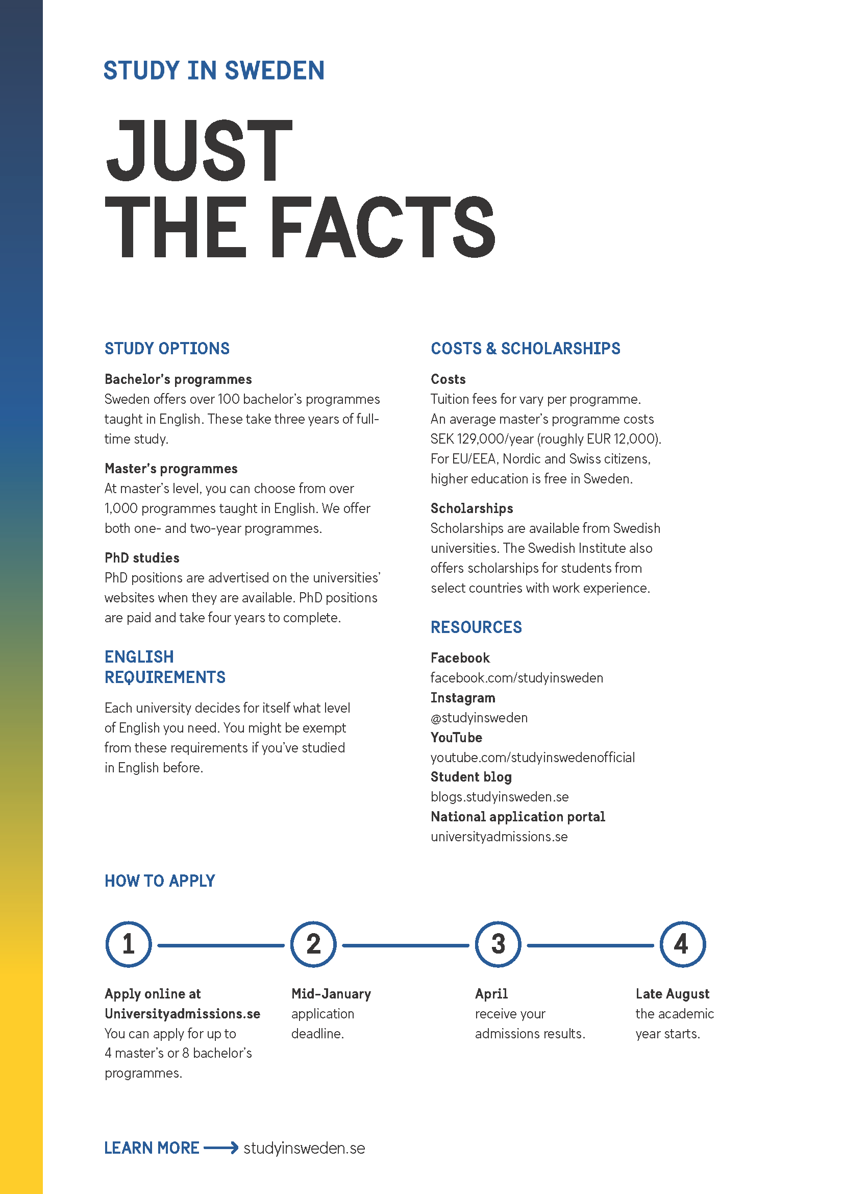 Study in Sweden fact sheet How to use the fact sheet Here you will find the most basic information about studying in Sweden in a handy factsheet. This publication is highly suitable for student fairs and we recommend using it together with the Study in Sweden brochure .