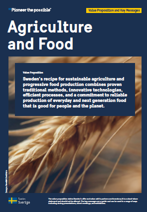 Agriculture and food – Cultivating reliable, safe and healthy food Log in and apply Photo: Per Pixel Petersson/imagebank.sweden.se About this toolkit Sweden’s recipe for sustainable agriculture and progressive food production combines proven traditional methods, innovative technologies, efficient processes, and a commitment to reliable production of everyday and next generation food that is good for people and the planet. You can use this toolkit to attract trade and investment within the agriculture and food sector.