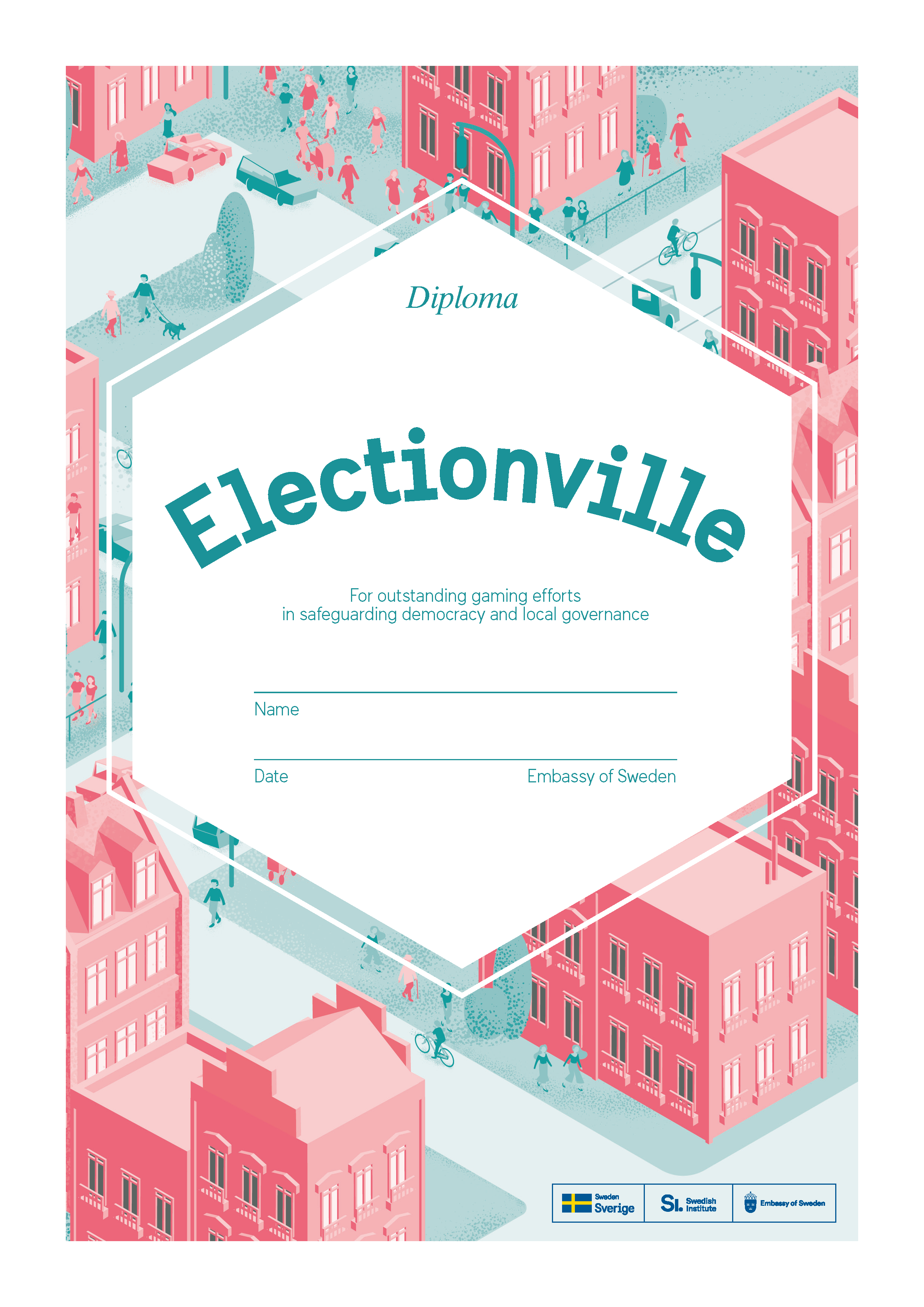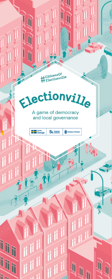 Photo: Embassy of Sweden and the Swedish Institute About this toolkit What is local governance? What really constitutes a democratic process? And whom does it serve? Electionville is a fictional city in the shape of an educational floor game, where the participants take on the challenging roles of county council members. Equally fun and engaging, the main objective of the Electionville toolkit is to educate about and provide insights into how democracy works.