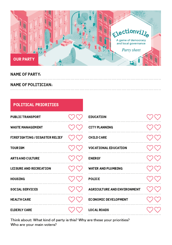 How to use Welcome to Electionville Electionville is primarily intended for people aged 15–24. However, due to its versatility, the Electionville toolkit is suitable for people of all ages and regardless of political affiliation. This makes Electionville the perfect tool for practicing core democratic values such as inclusiveness, participation, and gender equality. In fact, to engage in a game of Electionville is to engage in democracy.