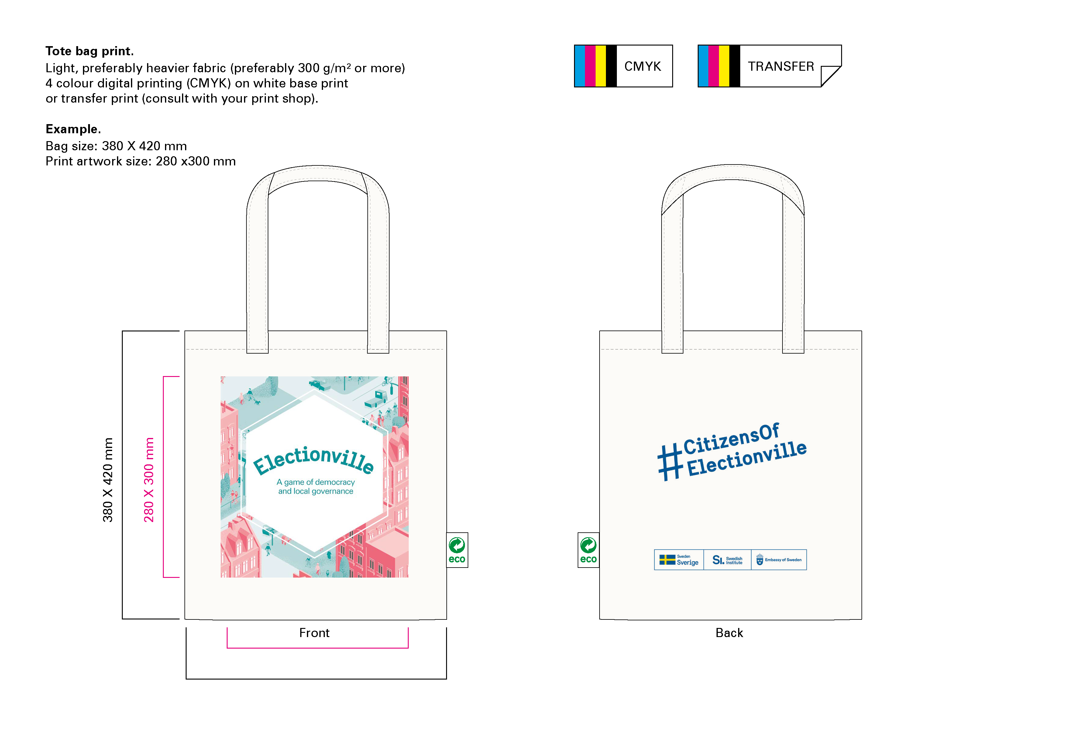 Communication material Download tote bag overview (PDF 186.2 KB) Tote bag overview Download tote bag artwork (PDF 14.7 MB) Tote bag artwork Download diploma (PDF 1.7 MB) Diploma for participants Social media Please use #CitizensOfElectionville in your social media work to highlight your activities with the initiative. We also encourage you to use any of the relevant Agenda 2030 logos.