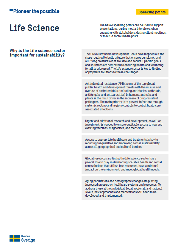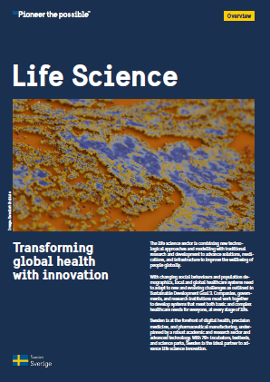 Life science sector – Transforming global health with innovation Log in and apply Photo: Sofia Sabel/imagebank.sweden.se About the life science sector Sweden is at the forefront of digital health, precision medicine, and pharmaceutical manufacturing, underpinned by a robust academic and research sector and advanced technology. With 70+ incubators, testbeds, and science parks, Sweden is the ideal partner to advance life science innovation. You can use this toolkit to attract trade and investment within the life science sector.