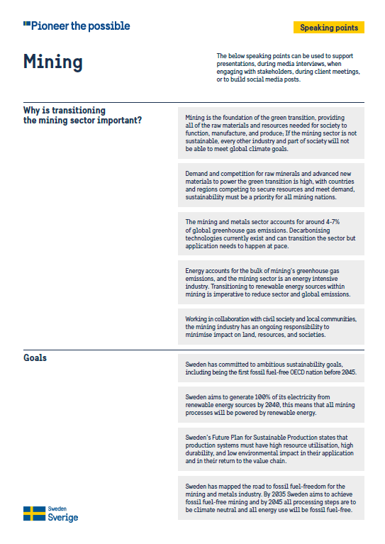 How to use this toolkit This toolkit supports trade promotion activities focusing on the green and digital transition within the mining sector. It is based on Pioneer the possible – a communication concept developed to promote Sweden from a business perspective. It can help you open doors, forge new partnerships and maintain key relationships.