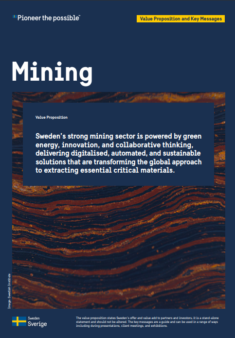 Mining sector – Sustainable, digitalised mining for a green future Log in and apply Photo: Fredric Alm/imagebank.sweden.se About the mining sector Sweden’s strong mining sector is powered by green energy, innovation, and collaborative thinking, delivering digitalised, automated, and sustainable solutions that are transforming the global approach to extracting essential critical materials. You can use this toolkit to attract trade and investment within the mining sector.