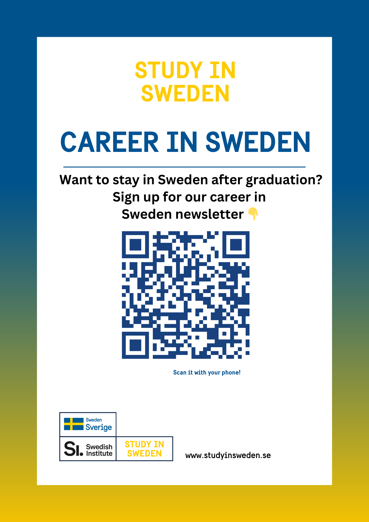 Please make sure to display the Career in Sweden QR code at your event and encourage students to scan it and sign up. After the event, we will get back to you with the number of students that signed up during your event.