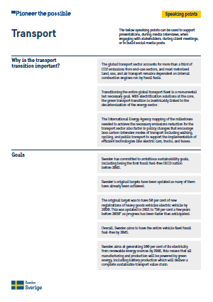 How to use this toolkit This toolkit supports trade promotion activities focusing on the green and digital transition within the transport sector. It is based on Pioneer the possible – a communication concept developed to promote Sweden from a business perspective. It can help you open doors, forge new partnerships and maintain key relationships.